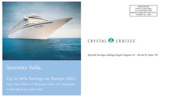 Enjoying an already robust database of Crystal Cruises guests, the brand worked with the High End Market Newspapers and local list managers to send individualized direct mail to 'lookalike' urban and suburban prospects with trackable reservation call-in numbers linked to Crystal Cruises' elite Platinum Crystal Cruises Travel Agencies, whose best agents answer the calls.