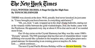 Top global travel journalists have helped make Crystal Cruises the #1 Luxury (Small Ship) Cruise Line in the World year after year. Introducing the new ship, Crystal Serenity offered natural opportunities for stories in the most influential travel publications, such as the New York Times.
